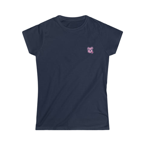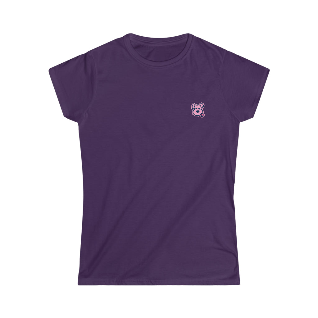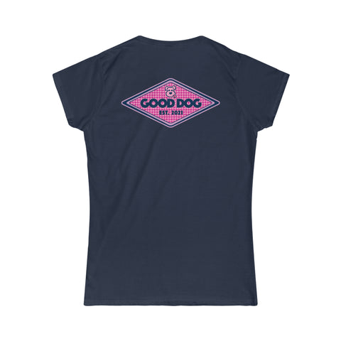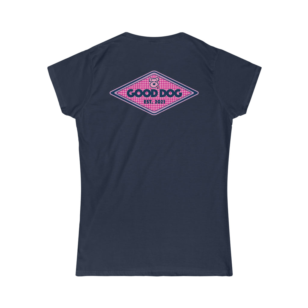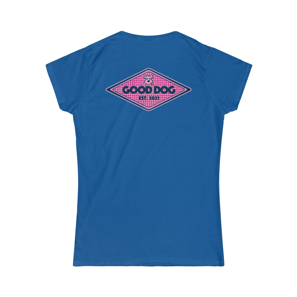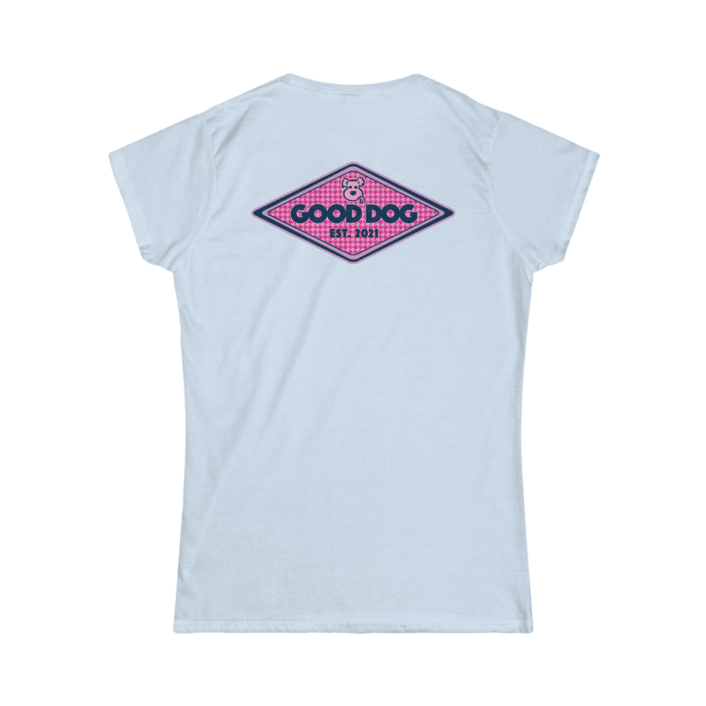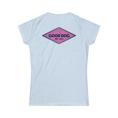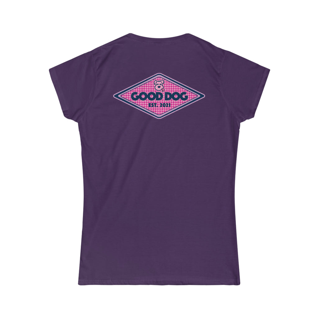 This t-shirt features the Diamond Dog design in a playful bubble gum colored pattern. This woman's softstyle tee is a more feminine take on the classic tee. The sleeves are shortened to reveal some shoulder. The fabric is a blend of cotton and polyester. There are no side seams because this shirt is knit in one piece. The shoulders are taped with twill to prolong durability. The collar seam is reinforced with ribbed knitting.